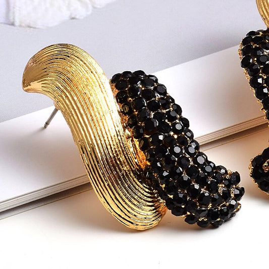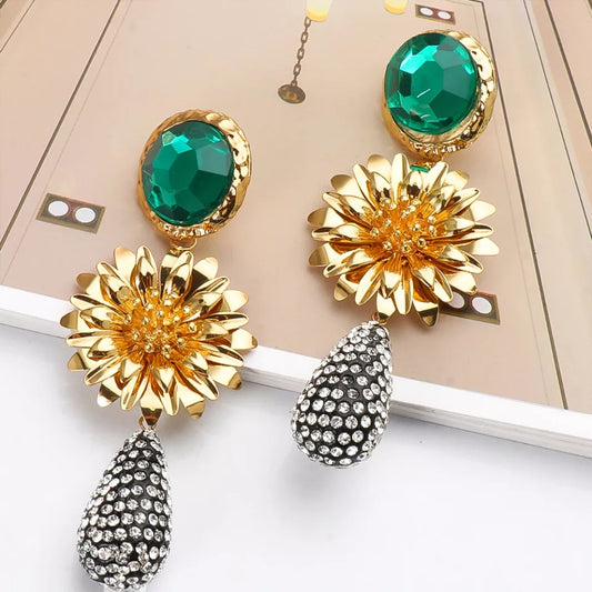 Flower Metal Rhinestone Long Dangle Drop Statement Earrings